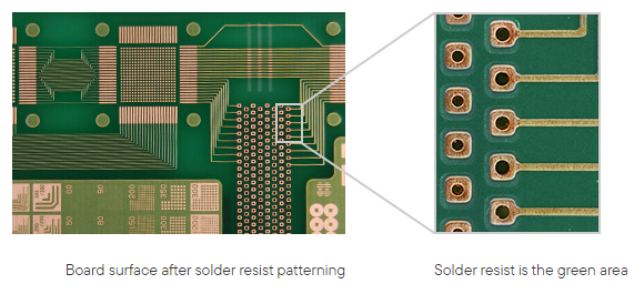 Solder resist protects circuit patterns from the affects of dust, heat, and moisture, ensuring that electronic devices will work for a long time.