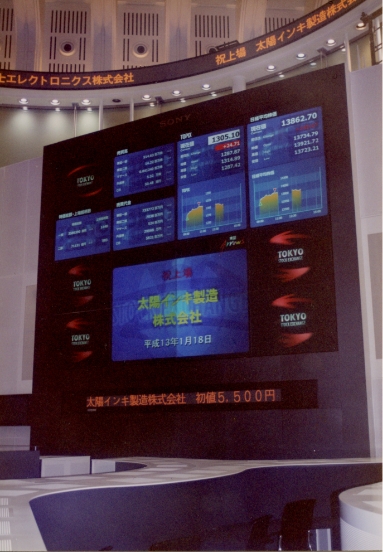 1月 東京証券取引所市場第一部に上場 2001年1月18日に東京証券取引所第一部に上場しました。この日は2001年の最初の新規上場が行われた日で、太陽インキは21世紀最初の東証一部上場会社となりました。 |