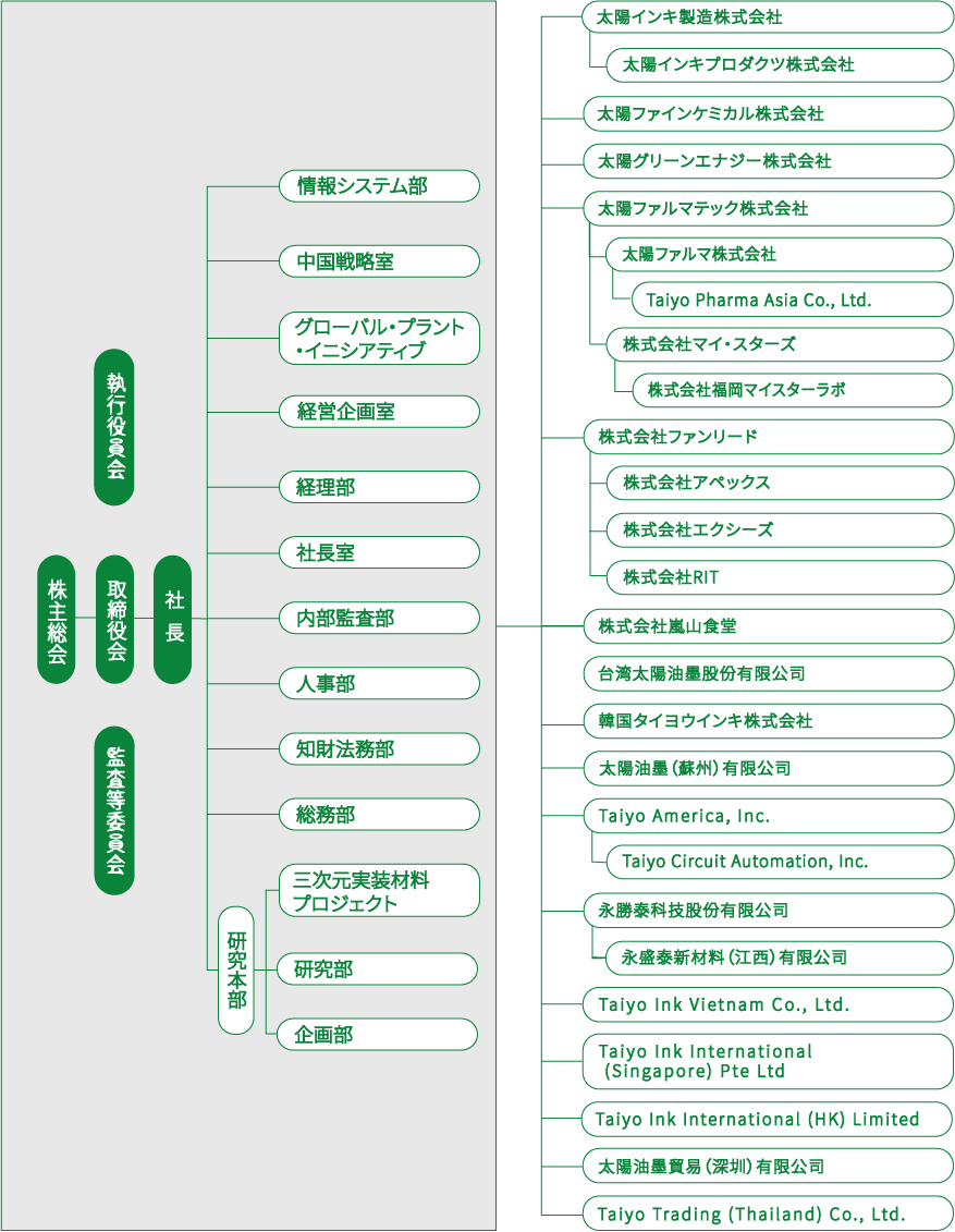 太陽インキ製造株式会社 太陽インキプロダクツ株式会社 太陽ファインケミカル株式会社 太陽グリーンエナジー株式会社 太陽ファルマテック株式会社 太陽ファルマ株式会社 Taiyo Pharma Asia Co., Ltd. 株式会社マイ・スターズ 株式会社福岡マイスターラボ 株式会社ファンリード 株式会社アペックス 株式会社エクシーズ 株式会社RIT 株式会社嵐山食堂 台湾太陽油墨股份有限公司 韓国タイヨウインキ株式会社 太陽油墨(蘇州)有限公司 Taiyo America, Inc. Taiyo Circuit Automation, Inc. 永勝泰科技股份有限公司 永盛泰新材料(江西)有限公司 Taiyo Ink Vietnam Co., Ltd. Taiyo Ink International (Singapore) Pte Ltd Taiyo Ink International (HK) Limited 太陽油墨貿易(深圳)有限公司 Taiyo Trading (Thailand) Co., Ltd. |