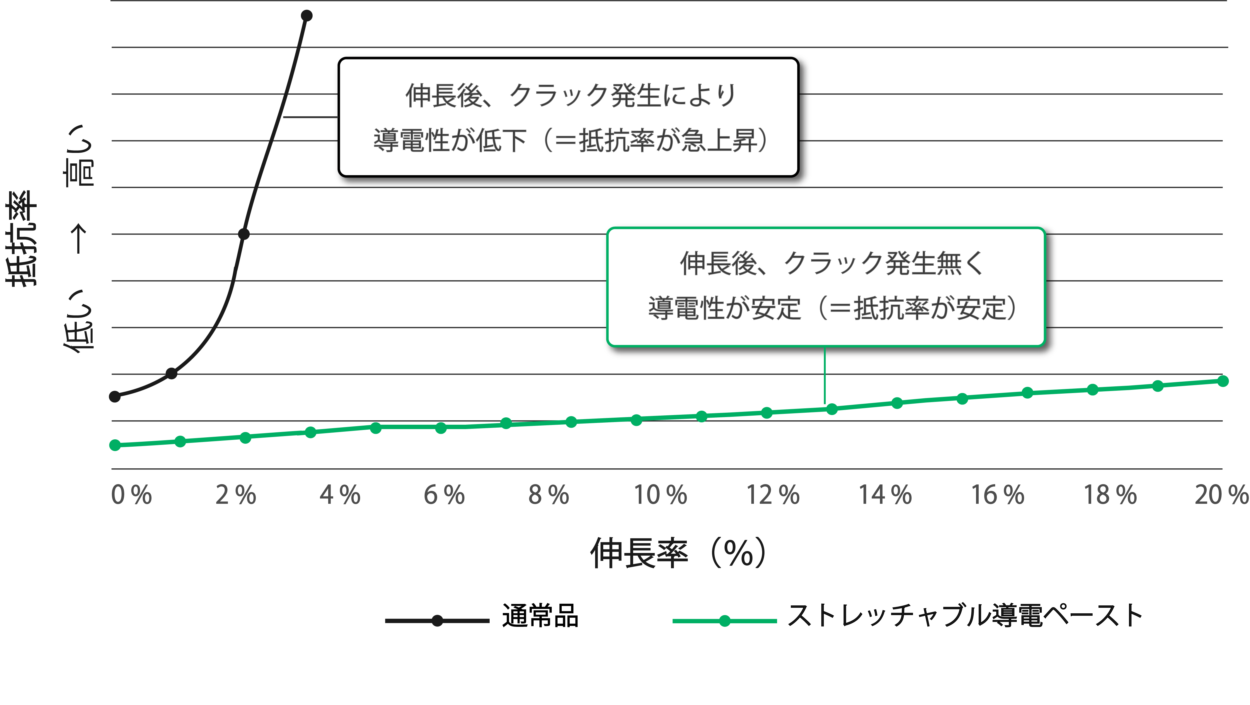 - 伸長時/伸縮繰り返し時でも高い導電性を維持。