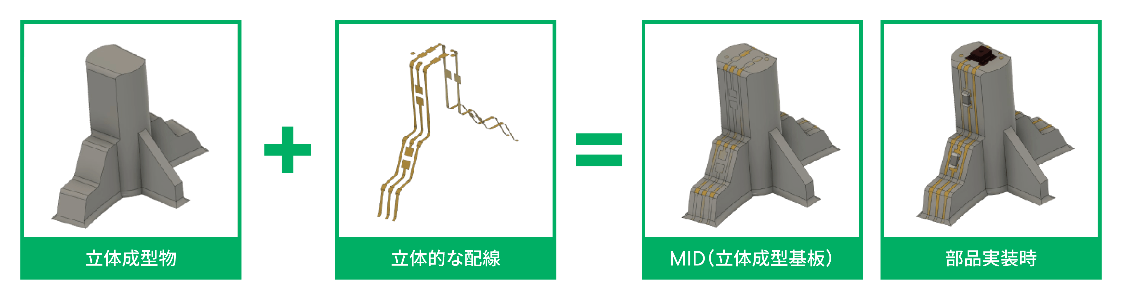 MID(Molded Interconnect Device)とは、機械的と電気的機能を持った電気回路配線付きプラスチック射出成形品のことをいいます。