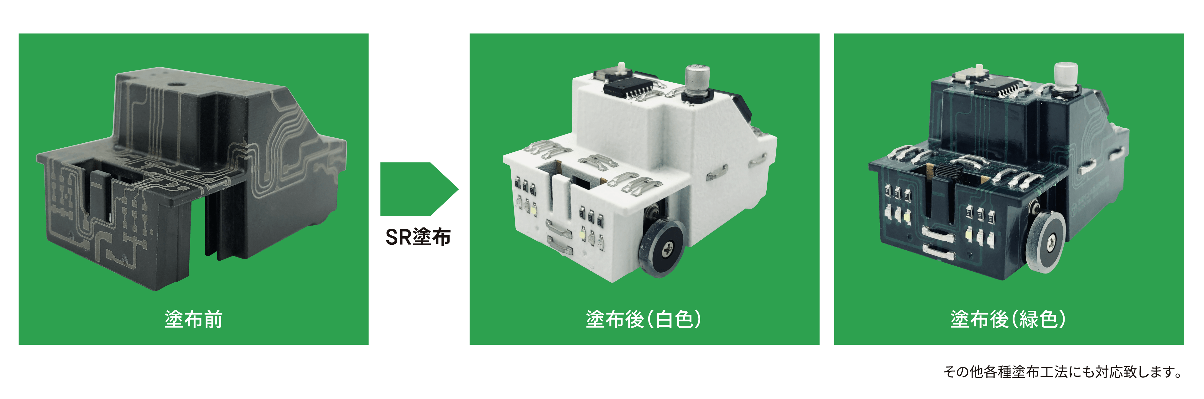 従来は「アンテナ用途」等の代表的なMID製品はソルダーレジストを必要としないと考えられてきました。しかし、当社SR処理を施したMIDは、MID基板の永久保護膜、つまり、ほこりや熱、湿気などから回路パターンを保護し、絶縁性を維持することで新たな付加価値が実現できます。