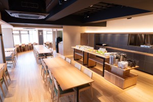 「本店嵐山食堂」は、社員向けに良質な食事を提供するという社員食堂本来の機能の他、お客様との打ち合わせや、社員同士のコミュニケーションの場、また大型スクリーンで映画鑑賞などを楽しむなど多目的での活用を予定しています。