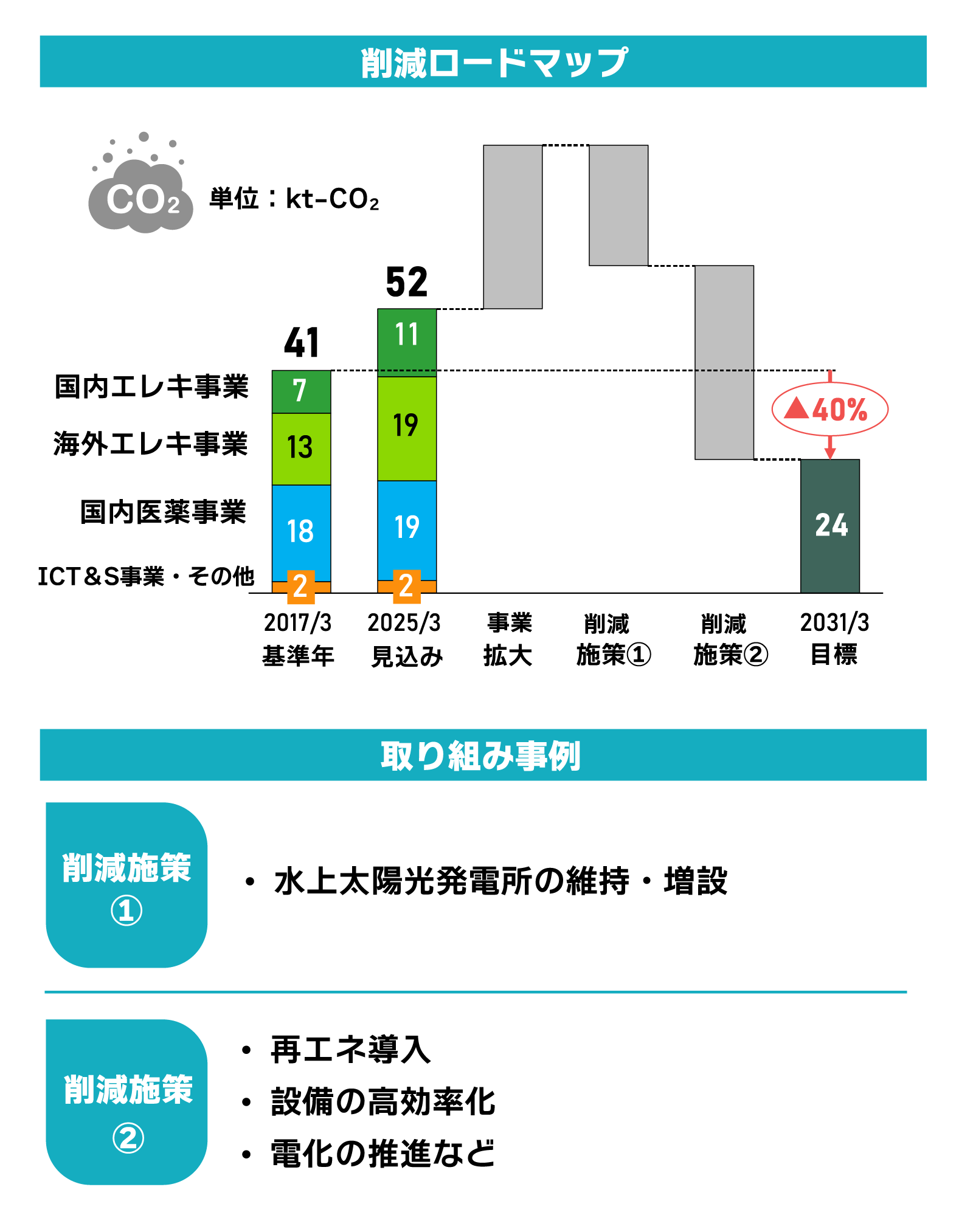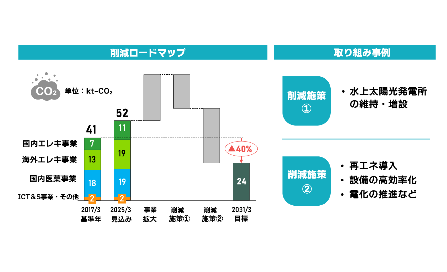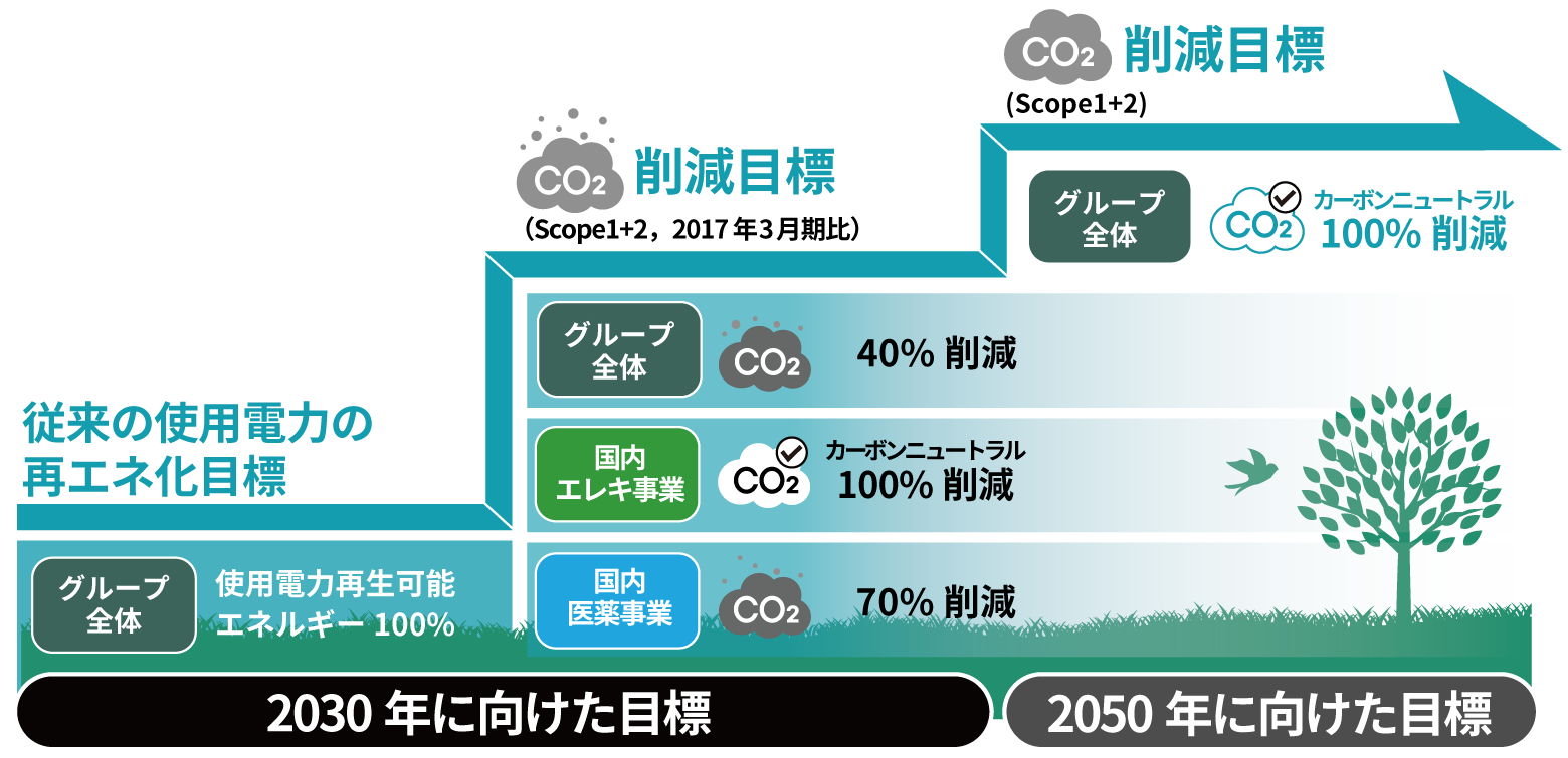 当社グループは、政府目標である2050年のカーボンニュートラル達成に向け、従来よりも更に一段階高いCO_{2}排出量削減目標として、2031年3月期にグループ全体で2017年3月期比40%削減を掲げています。また、2031年3月期に国内のエレクトロニクス事業においては、カーボニュートラル達成、国内の医療・医薬品事業においては70%削減を目指し、グループ全体で2050年にはカーボンニュートラル達成を実現します。