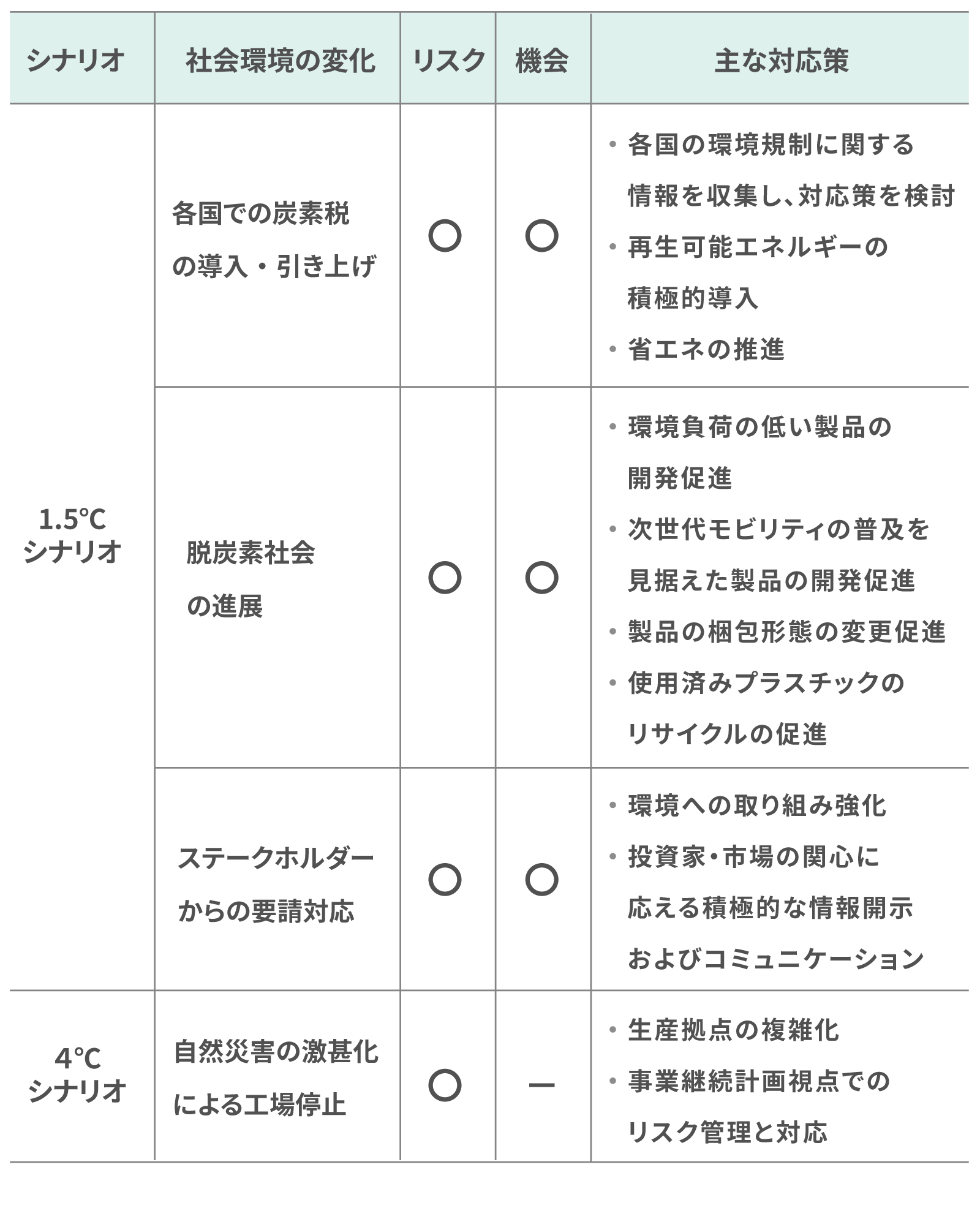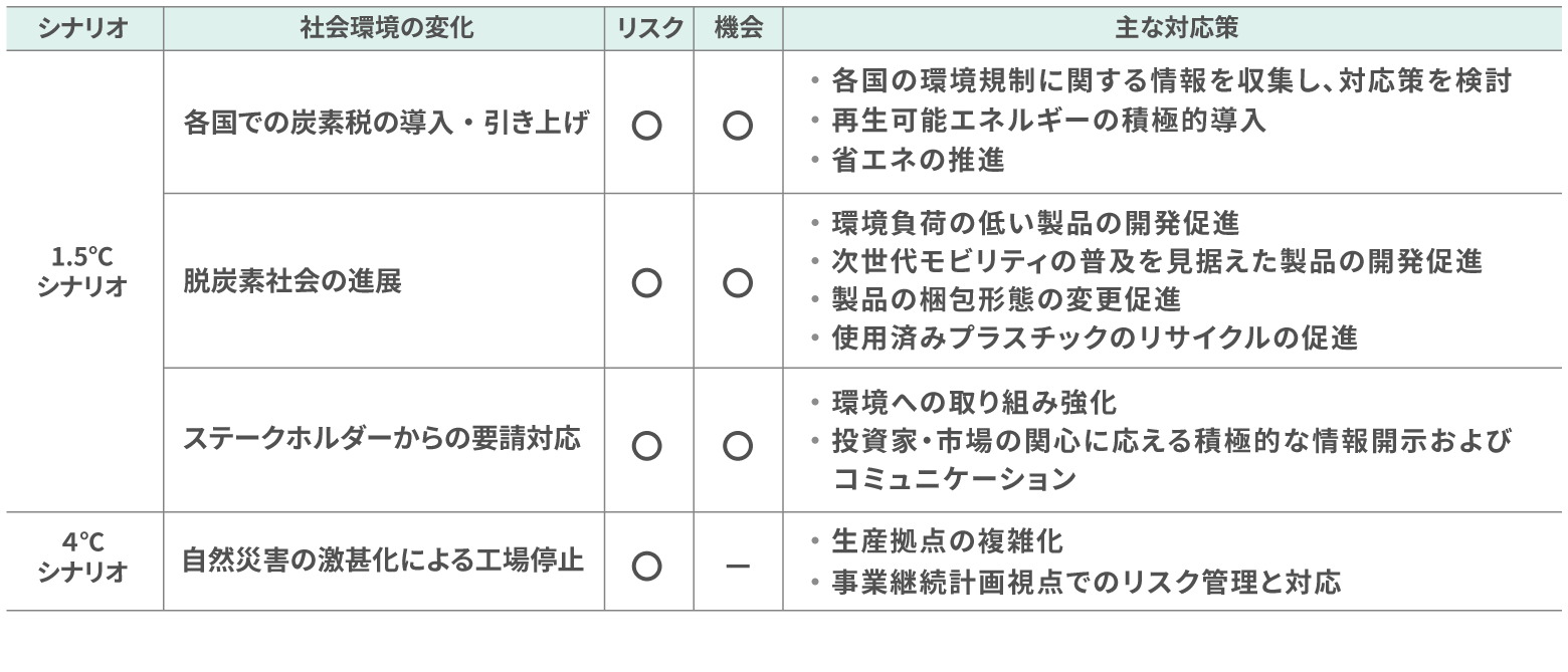 気候変動に伴うリスクと機会を特定し、気候変動に関する政府間パネル(IPCC:Intergovernmental Panel on Climate Change)の第6次評価報告書や、国際エネルギー機関(IEA:International Energy Agency)の世界エネルギー見通し(WEO:World Energy Outlook)などを参考に、1.5℃シナリオと4℃シナリオを考慮したシナリオ分析を実施しています。今後の当社グループの事業活動において、リスクの低減及び機会を捉え、社会課題の解決につながる製品を開発していきます。