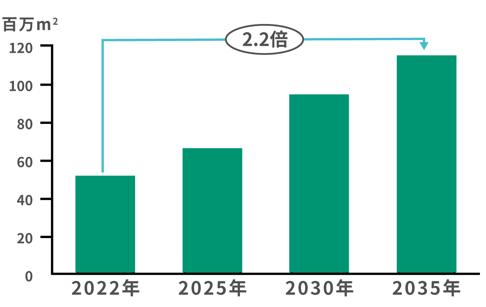 次世代モビティの普及による自動車の電動化・電装化に伴い、自動車1台当たりの使用基板面積が、2035年までに2022年比で約2.2倍になることが予想されています。この基板面積増加に伴うSRの使用量の増加を当社事業の機会と捉え、さらなる開発促進に努めます。