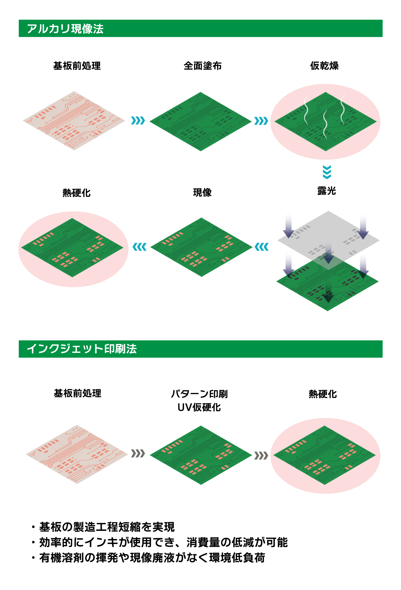 アルカリ現像型のSRは基板全面に塗布した後、露光・現像という工程により不要な箇所を除去し、回路パターンを形成しています。インクジェットSRは、インクジェット印刷法により必要な箇所にのみ塗布し、回路パターンを形成することができます。そのため、アルカリ現像型SRと比較し、顧客の工程の大幅な簡略化が可能になり、基板の製造コスト削減や環境負荷の低減に有効です。当社グループでは、車載基板向けに顧客での採用が決定し、量産を開始しました。また、SR用途だけでなく、マーキングインキ、めっきレジスト、エッチングレジスト、ディスプレイ用材料等、様々な用途に向けたインクジェット法に対応した製品開発を進めています。