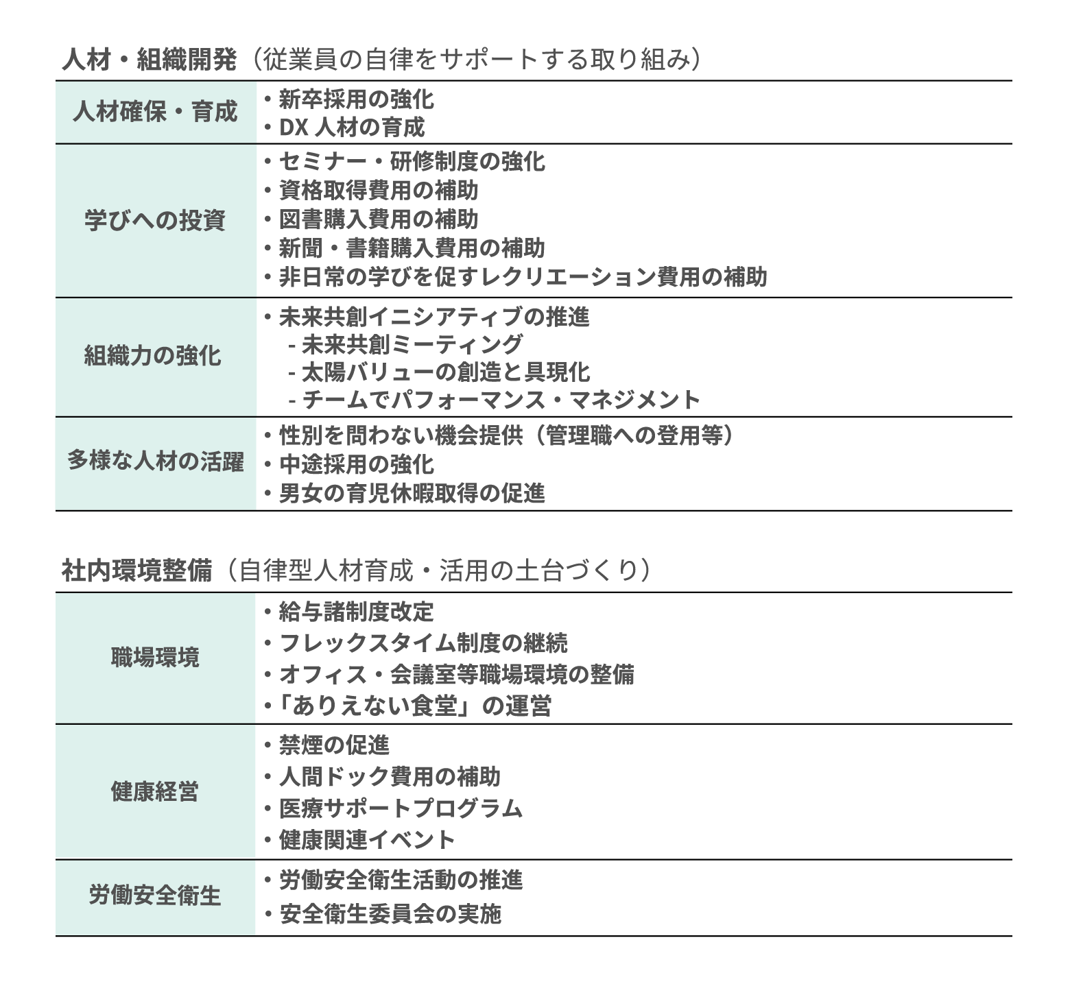 当社グループでは、経営理念を実現するため、自らの意志で未来を描き、物事の本質を捉えた判断と、周囲を巻き込んだ業務遂行ができる自律型人材を個人と組織の両面から育成するための人材・組織開発に取り組むと同時に、自律型人材の育成の土台となる社内環境整備も積極的に進めています。